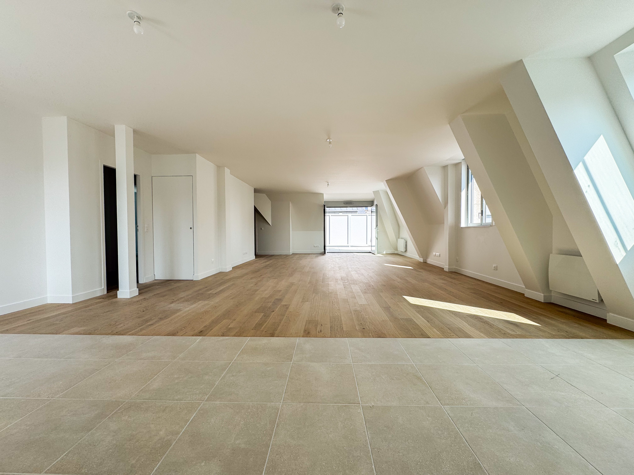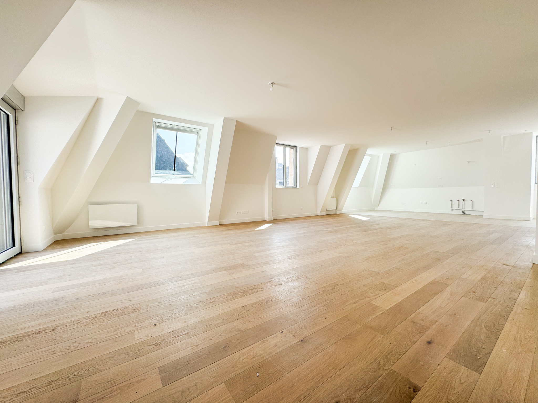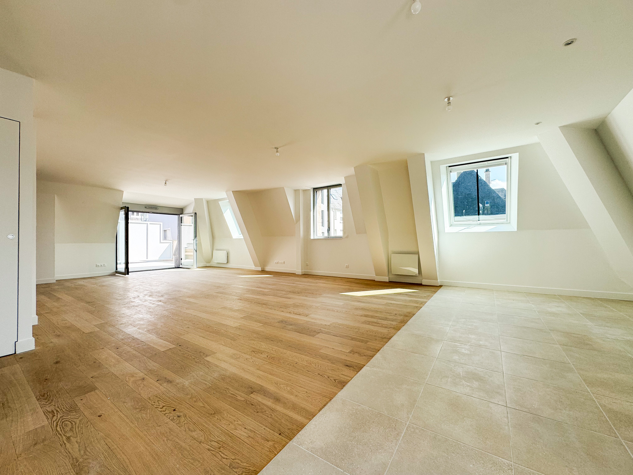 LORIENT HYPER CENTRE, vaste T5 neuf de près de 150 m2 habitable dans un immeuble historique du centre ville. Il se compose au premier niveau d’une entrée avec rangements, pièce de vie de plus de 63 m2 donnant sur une terrasse de 15m2, 2 chambres et une salle d’eau avec wc. Au dessus : 2 chambres, une salle d’eau et un wc séparé.